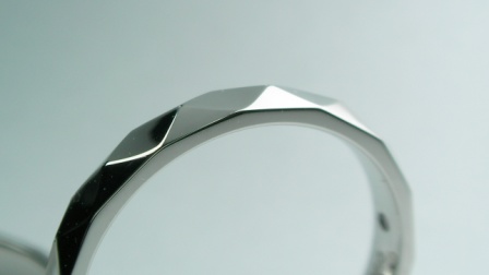 プラチナ950のリング全体に、R面の ◆ ひし形を15面削り出し、斜めの ▲ 三角面を30面を鉄ヤスリで削り出したリングになっております。